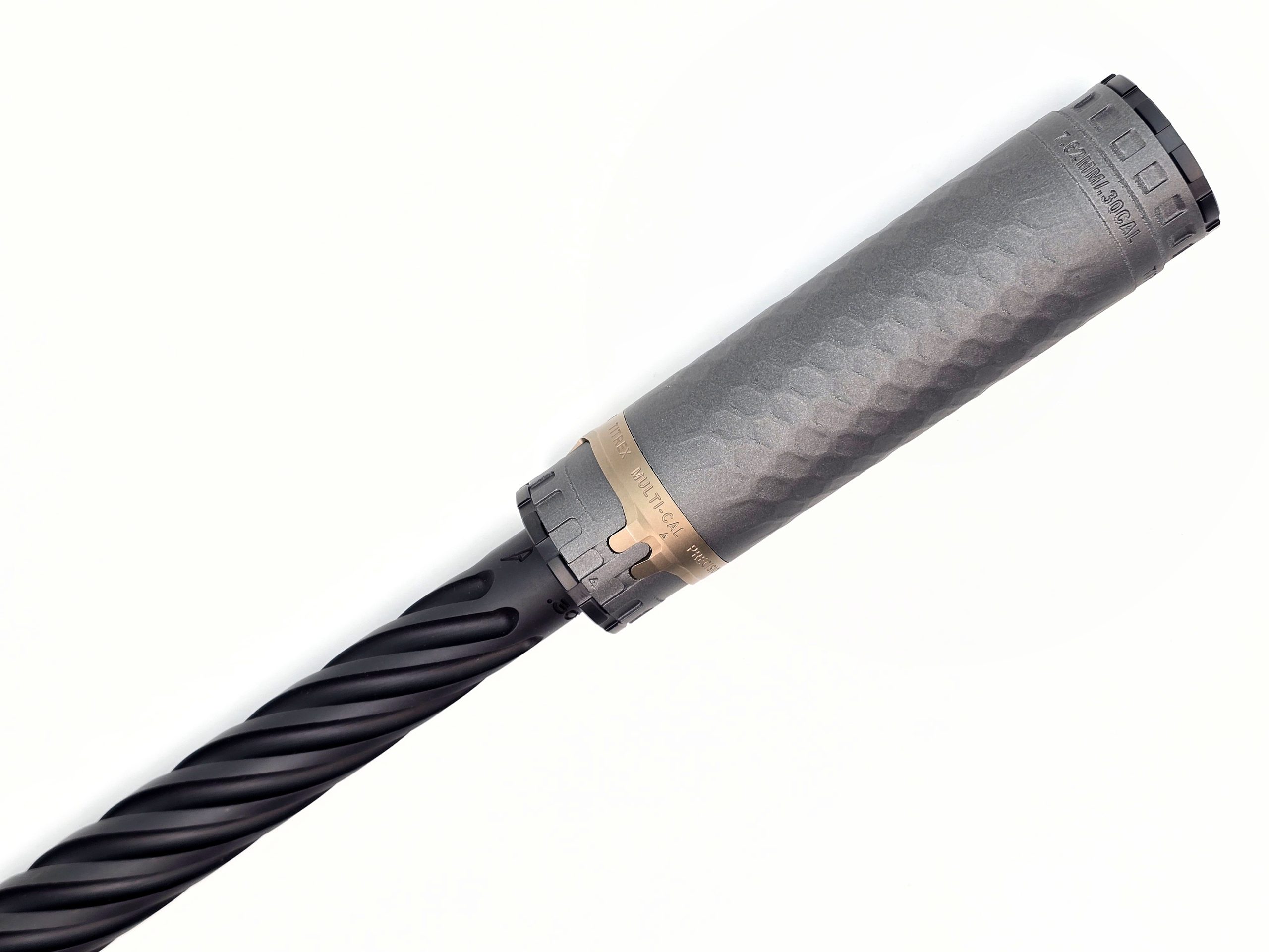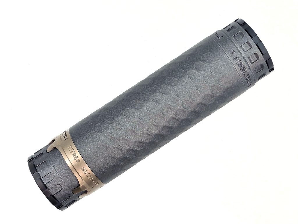 3D-printed from Grade 5 titanium, the TiTrex is one of the smaller, lighter .30 cal cans on the market at just 6.2 inches long and weighing only 9.2 ounces including the mount and front cap (5.9 in and 7.2 oz for the body alone). Inch-for-inch, it just might be the quietest .30 cal suppressor available. Even when paired up against longer, fatter, heavier cans, it beats out nearly all of them.