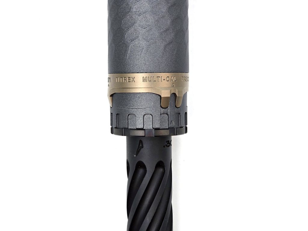 Xband: that good-looking 17-4 stainless steel ring around the base of the TiTrex is the serialized part of the silencer. It’s marked as Multi-Cal and it’s pressed onto the body where it clicks firmly into place. Precision Armament does this to achieve “endless upgradeability” and “unlimited repairability.” It basically future-proofs your TiTrex, as Precision Armament is able to remove the Xband and install it on a new core, whether that’s to replace a damaged core or to swap it for a new one of a different design, material, or caliber.