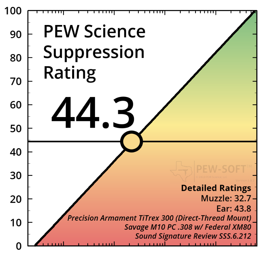 Shortly after our first range session with the TiTrex, Jay of PEW Science released his Sound Signature Review on it. Especially in the members-only PEW Science reports, there are many data points by which to compare suppressors, but the short version here is that Jay’s science corroborates (as it’s supposed to) Dan’s and my real-life, human ear experience with the TiTrex.