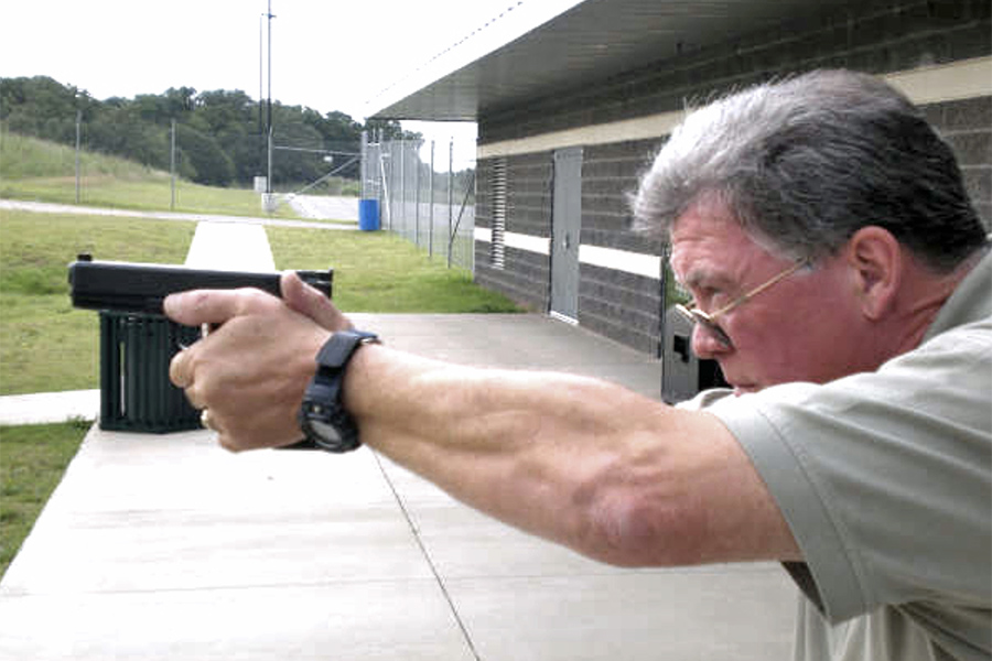 The support hand needs to be as seamless as the primary hand. The index finger of the support hand must be crushed up under the trigger guard with the support side wrist locked down. To test for this, have the shooter unfold the fingers of the left hand after taking the two-hand grip. If the fingers point forward, you have a weak, no-bone-support grip; if they’re pointing down, the grip is right.